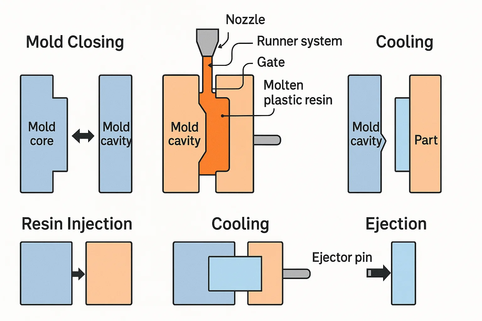 Injeksi Resin: Resin plastik cair disuntikkan di bawah tekanan tinggi melalui nosel dan masuk ke dalam cetakan. Material bergerak melalui Sistem pelari and gerbang —Yang adalah bagian dari rongga setengah - dan mengisi ruang antara inti dan rongga. Inti menggantikan resin untuk membentuk bentuk internal bagian, sedangkan rongga membentuk cangkang luar.