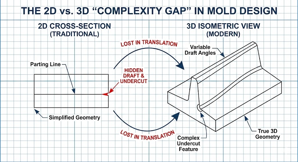 - Ketidakcocokan Geometris: Desain 2D sering kali kekurangan data untuk sudut draf yang bervariasi, yang penting untuk pelepasan komponen plastik kompleks dengan bersih.