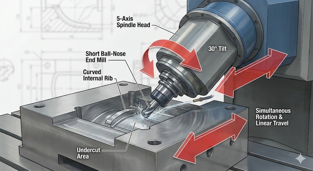 Pemotongan 5 sumbu adalah proses manufaktur subtraktif di mana mesin CNC menggerakkan alat pemotong atau benda kerja melintasi lima sumbu berbeda secara bersamaan. Di desain cetakan , teknologi ini memungkinkan spindel tetap tegak lurus terhadap permukaan yang rumit dan melengkung, sehingga memungkinkan terciptanya rongga yang dalam, dinding yang curam, dan potongan bawah yang rumit yang secara fisik tidak mungkin dijangkau dengan peralatan 3 sumbu standar.