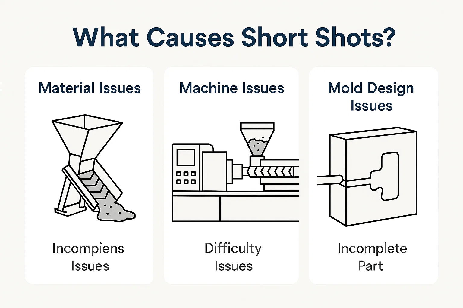 Mendiagnosis tembakan pendek membutuhkan pendekatan sistematis, karena penyebabnya dapat berasal dari beberapa area berbeda dari proses pencetakan injeksi. Masalah yang paling umum dapat ditelusuri kembali ke material, pengaturan mesin, atau desain cetakan itu sendiri.